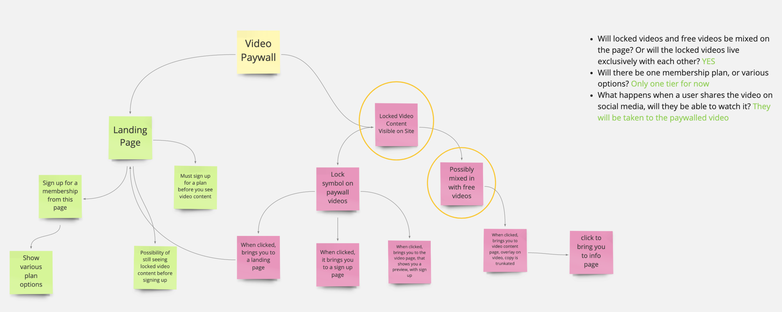 A look into my brainstorm on the various ways I could set up the video paywall structure. Based on my answered questions, I decided to go with keeping the premium locked content visible to all users. This increases the chance of a member seeing something they’d like to watch, and signing up to get through the paywall.